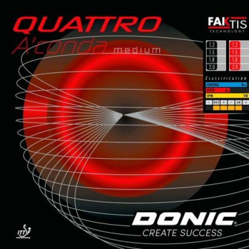 DONIC QUATTRO ACONDA utiliza la tecnología FAKTIS para producir una goma allround y defensiva. En lugar de goma sintética, Donic ha utilizado el proceso de ablandamiento con una goma natural, que es más lento pero ofrece el máximo agarre.El ser más blanda, asegura que la goma tenga un "sweet spot" más grande cuando hace contacto con la pelota. El resultado es más efecto de retroceso, mayor contacto y control óptimo de la pelota. La tecnología FAKTIS ha proporcionado a DONIC QUATTRO ACONDA una goma natural adherente, que conserva sus cualidades de efecto durante mucho más tiempo. Muy recomendable para un juego completo y una defensa agresiva. Perfecto para todo tipo de variaciones de efectos.