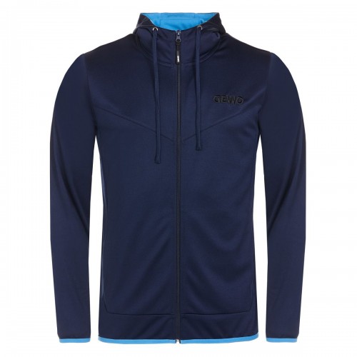 Con su diseño moderno y colores contrastantes, nuestro chándal no solo es funcional, sino también un verdadero punto de atracción. El azul oscuro le confiere una elegancia atemporal, mientras que los detalles en cian le aportan un toque de color y personalidad. El logotipo de Gewo está discretamente bordado en negro y no desluce el estilo "menos es más". Gracias a su sobria paleta de colores, el Vigo se combina fácilmente con otros tejidos y completa el look de entrenamiento de tu uniforme. Tanto la chaqueta como el pantalón cuentan con dos prácticos bolsillos frontales con cremallera; la capucha de la chaqueta se ajusta perfectamente a la forma de la cabeza mediante un cordón y ofrece una buena protección contra el viento. El corte del Vigo es ceñido para que no te distraigas con el exceso de tela ondeando mientras entrenas, juegas o corres. Por supuesto, el Vigo te ofrece toda la libertad de movimiento necesaria para que no pierdas ni una sola bola en la mesa.