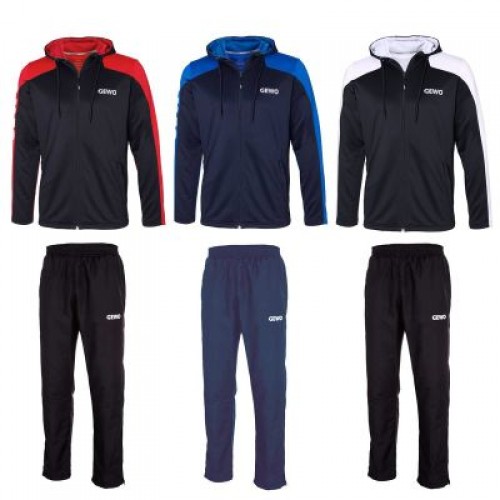 Sudadera con capucha GEWO Leo (Art. n.° 10718) junto con el pantalón deportivo GEWO Lifestyle Basic (Art. n.° 9159). Chaqueta con capucha, cremallera completa, dos bolsillos laterales, logotipo GEWO bordado en el pecho izquierdo, logotipo GEWO estampado en la manga derecha, puños rectos, manga larga y espalda con efecto flocado. Corte recto, corte holgado e informal. Material: 100 % poliéster (Poly Terry/Micro Dryfit).