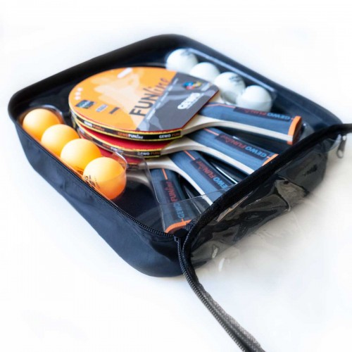 Set GEWO Family & Friends: 4 raquetas de TT de alta calidad con gomas interiores con puntos rojos y negros, base de esponja de 1,6 mm y madera de TT con núcleo más resistente y mangos cóncavos. Incluye 8 pelotas de entrenamiento y una práctica bolsa con cremallera. Para jugadores aficionados con más experiencia que disfrutan de un ritmo variable. También es ideal para iniciarse en el TT de club.